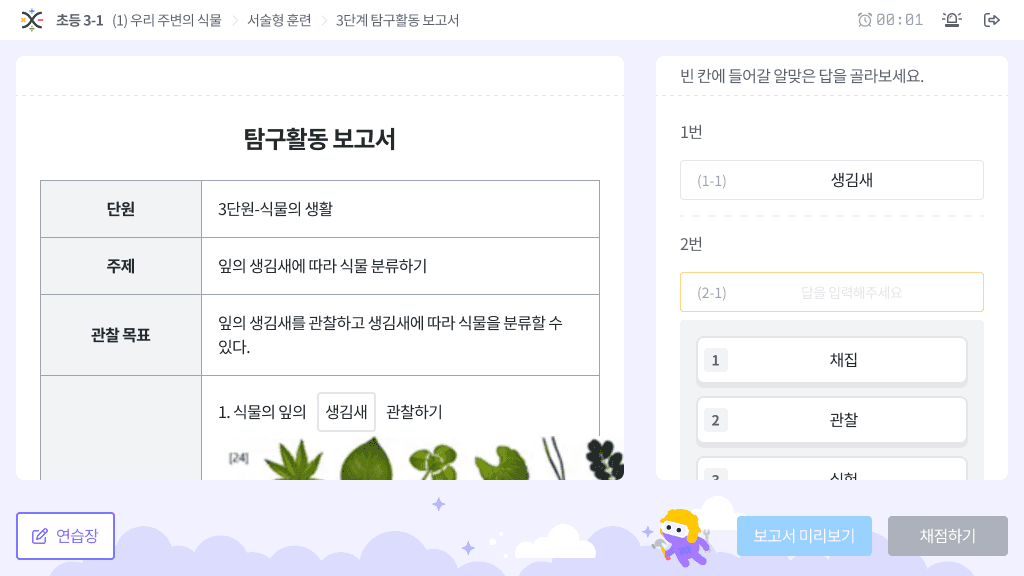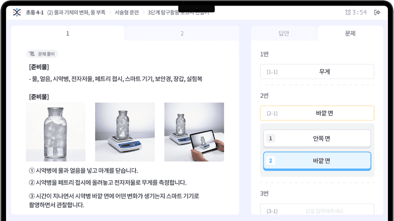 단계별 구성된 서술형 풀이를 채우고 배열하며 최종 탐구 보고서 작성 능력을 기름